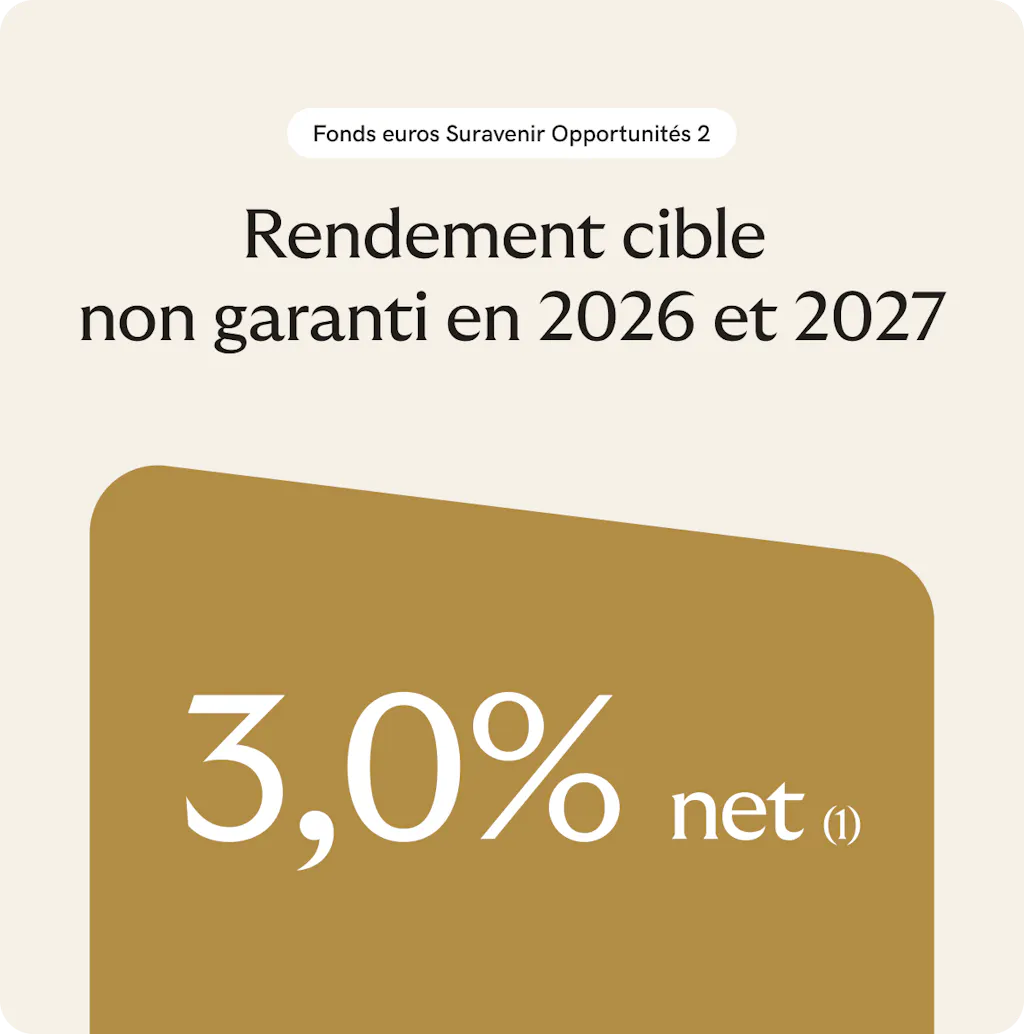*Objectif de rendement non garanti du fonds en euros Suravenir Opportunités 2 pour 2026, net de frais annuels de gestion, hors prélèvements fiscaux et sociaux et hors frais éventuels liés aux garanties décès. Bénéficiez d'une bonification de 1% ou 1,50% net sur le taux de rendement qui sera servi en 2026 sur ce fonds euros. Offre valable du 01/01/26 au 31/03/26 pour tout versement d'un montant de 100 000 euros minimum effectué pendant cette période (hors versement programmé et hors versement issu d’un rachat ou d'un transfert Pacte d'un contrat détenu chez Suravenir) : 1,00 % net de bonification pour un versement sans contrainte d’investissement d’unités de compte ou 1,50 % net de bonification pour un versement investi à 40 % minimum en unités de compte