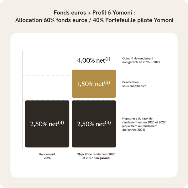 Cet objectif de rendement est non garanti et prend comme hypothèse un rendement net hors bonification équivalent au rendement de l’année 2025 (soit 3,00 % net (4) ) associé à une bonification de 1,50 % net (3) maximum.
