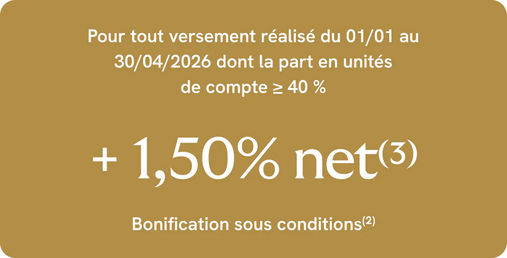 En choisissant cette option, vous bénéficiez d’un bonus + 1,50 % net (3) sur le taux de rendement qui sera servi en 2026 et 2027 sur ce fonds en euro.
