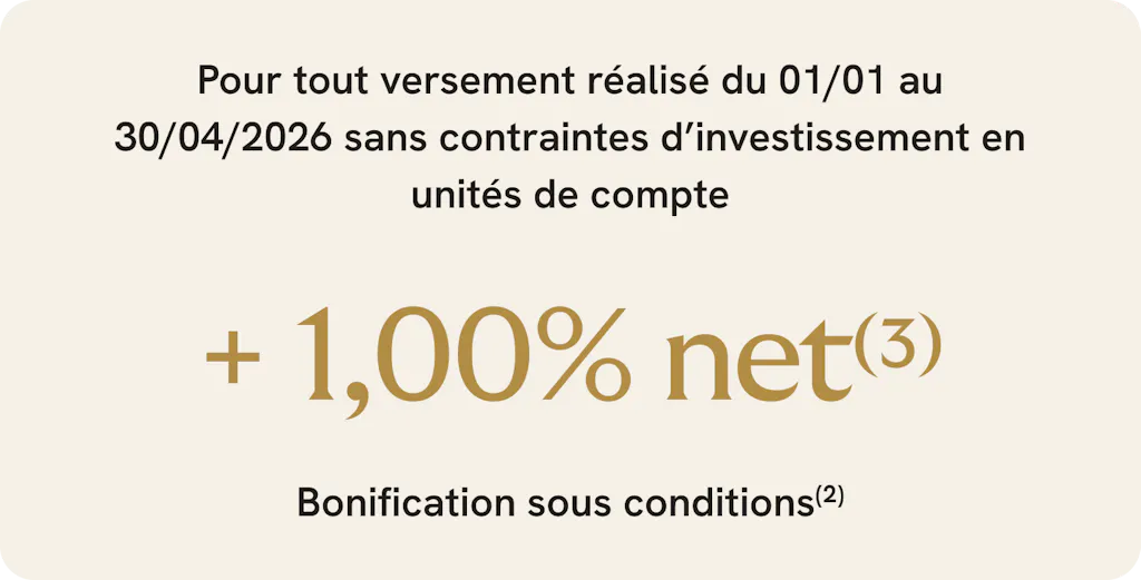 (2) Du 01/04/2026 au 30/04/2026, Suravenir applique une bonification sur le taux de rendement qui sera servi en 2026 et 2027 sur le fonds en euros Suravenir Opportunités 2 en gestion libre. Offre valable pour tout versement d'un montant de 100 000 euros minimum effectué pendant cette période (hors versement programmé et hors versement issu d’un rachat ou d'un transfert Pacte d'un contrat détenu chez Suravenir) : 1,00 % net(3) de bonification pour un versement sans contrainte d’investissement d’unités de compte ou 1,50 % net(3) de bonification pour un versement investi à 40 % minimum en unités de compte.