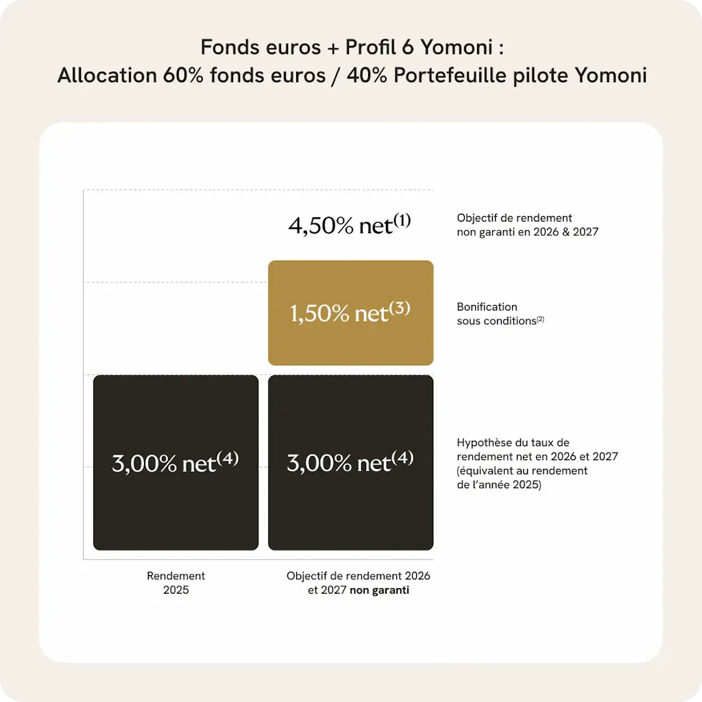 Cet objectif de rendement est non garanti et prend comme hypothèse un rendement net hors bonification équivalent au rendement de l’année 2025 (soit 3,00 % net (4) ) associé à une bonification de 1,50 % net (3) maximum.
