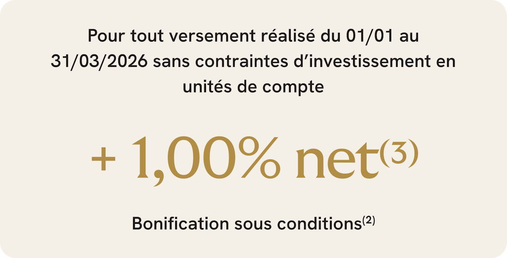 (2) Du 01/01/2026 au 31/03/2026, Suravenir applique une bonification sur le taux de rendement qui sera servi en 2026 et 2027 sur le fonds en euros Suravenir Opportunités 2 en gestion libre. Offre valable pour tout versement d'un montant de 100 000 euros minimum effectué pendant cette période (hors versement programmé et hors versement issu d’un rachat ou d'un transfert Pacte d'un contrat détenu chez Suravenir) : 1,00 % net(3) de bonification pour un versement sans contrainte d’investissement d’unités de compte ou 1,50 % net(3) de bonification pour un versement investi à 40 % minimum en unités de compte.
