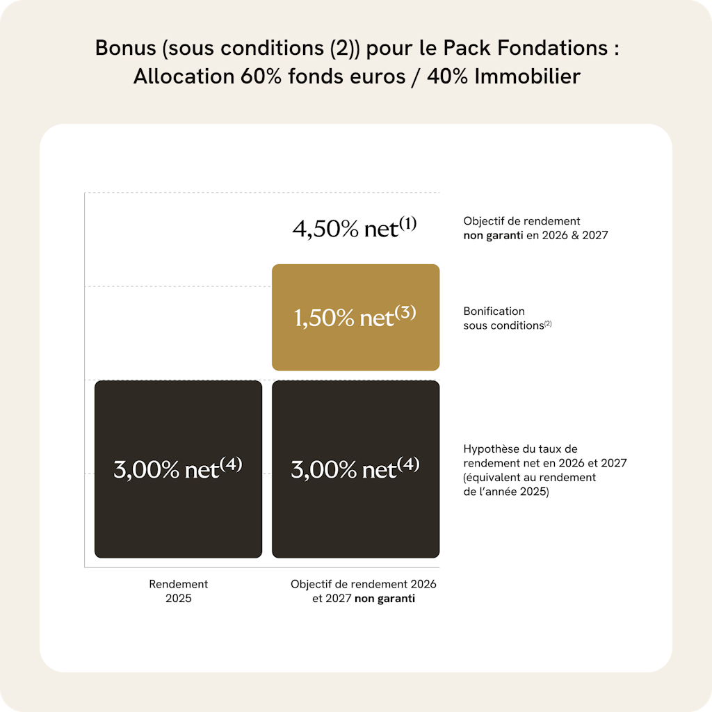 Cet objectif de rendement est non garanti et prend comme hypothèse un rendement net hors bonification équivalent au rendement de l’année 2025 (soit 3,00 % net (4) ) associé à une bonification de 1,50 % net (3) maximum.