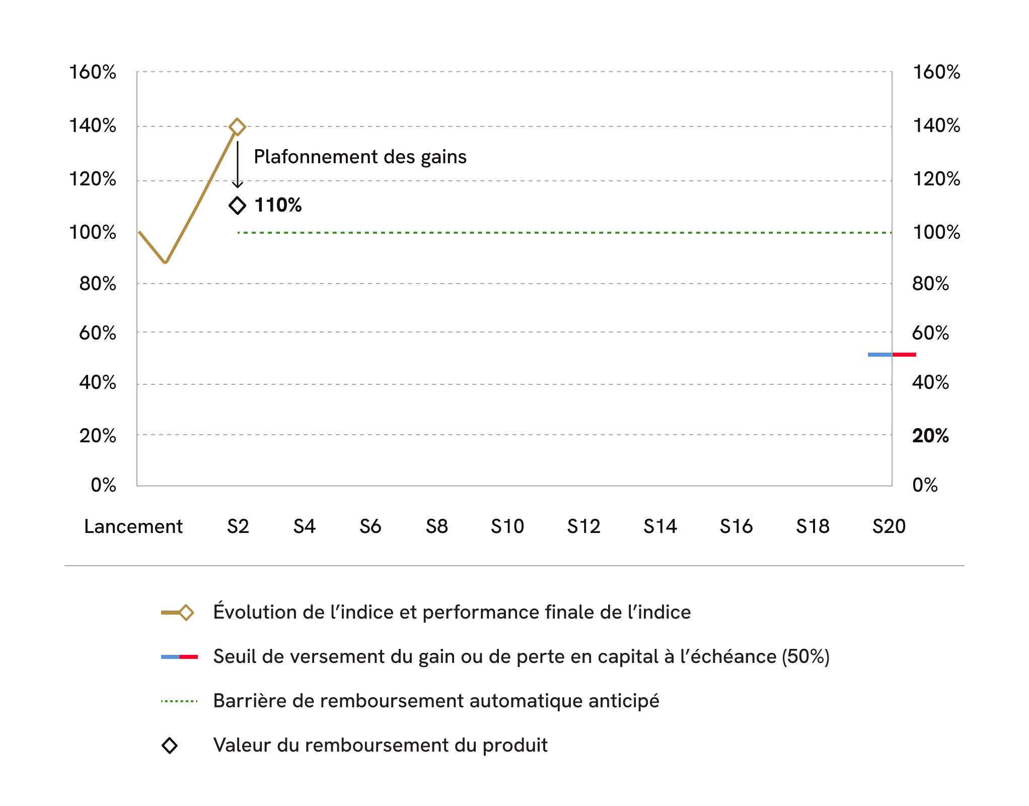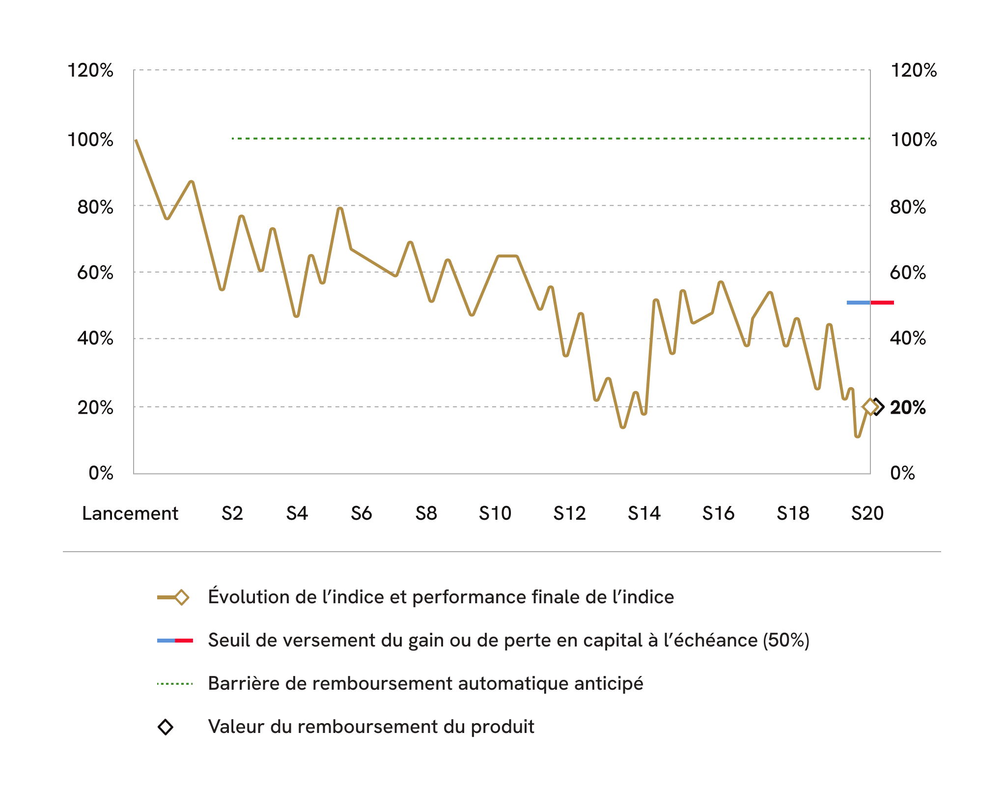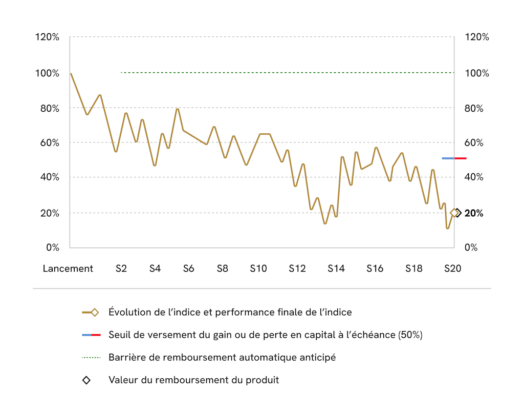 L’investisseur reçoit donc la valeur finale de l’indice exprimée en pourcentage de sa valeur initiale, soit 20,00 % du capital initial. Pour un investissement de 50 000 €, le montant remboursé est donc de 10 000 €, ce qui correspond à une perte en capital de 40 000 €.