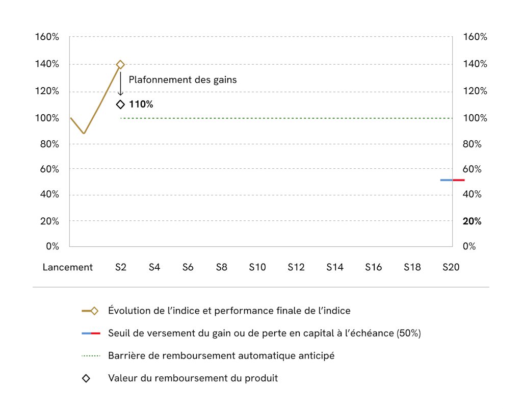- À chaque date de constatation semestrielle, à partir du 2ᵉ semestre, le niveau de clôture de l’indice reste strictement inférieur à la barrière de remboursement automatique anticipé. Le mécanisme de remboursement automatique anticipé ne s’active donc pas, et le produit se poursuit jusqu’à son échéance.