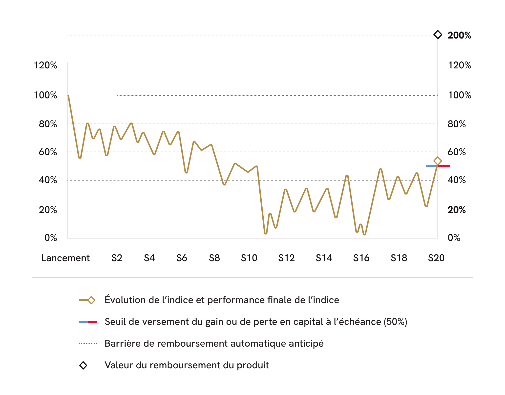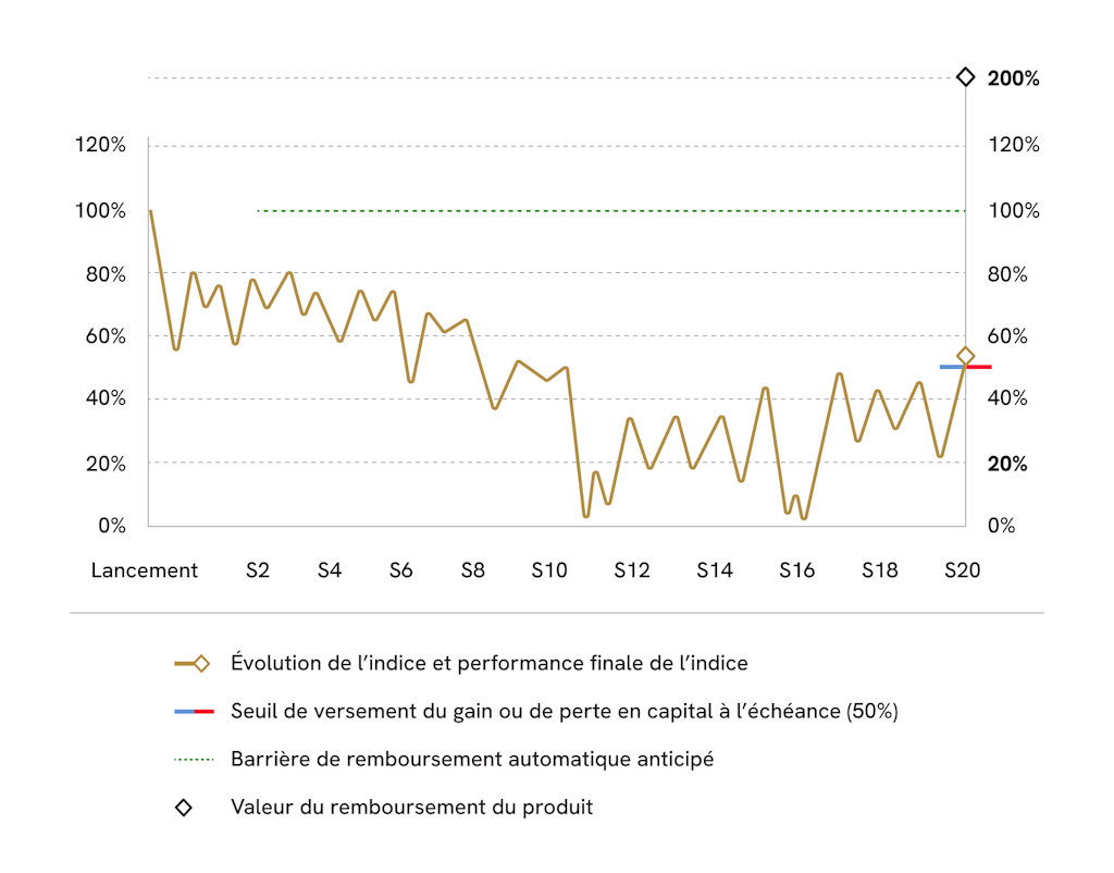- Semestres 2 à 20 : à chaque date de constatation semestrielle, l’indice clôture en dessous de son niveau initial. Le mécanisme de remboursement automatique anticipé ne s’active pas, et le produit continue.