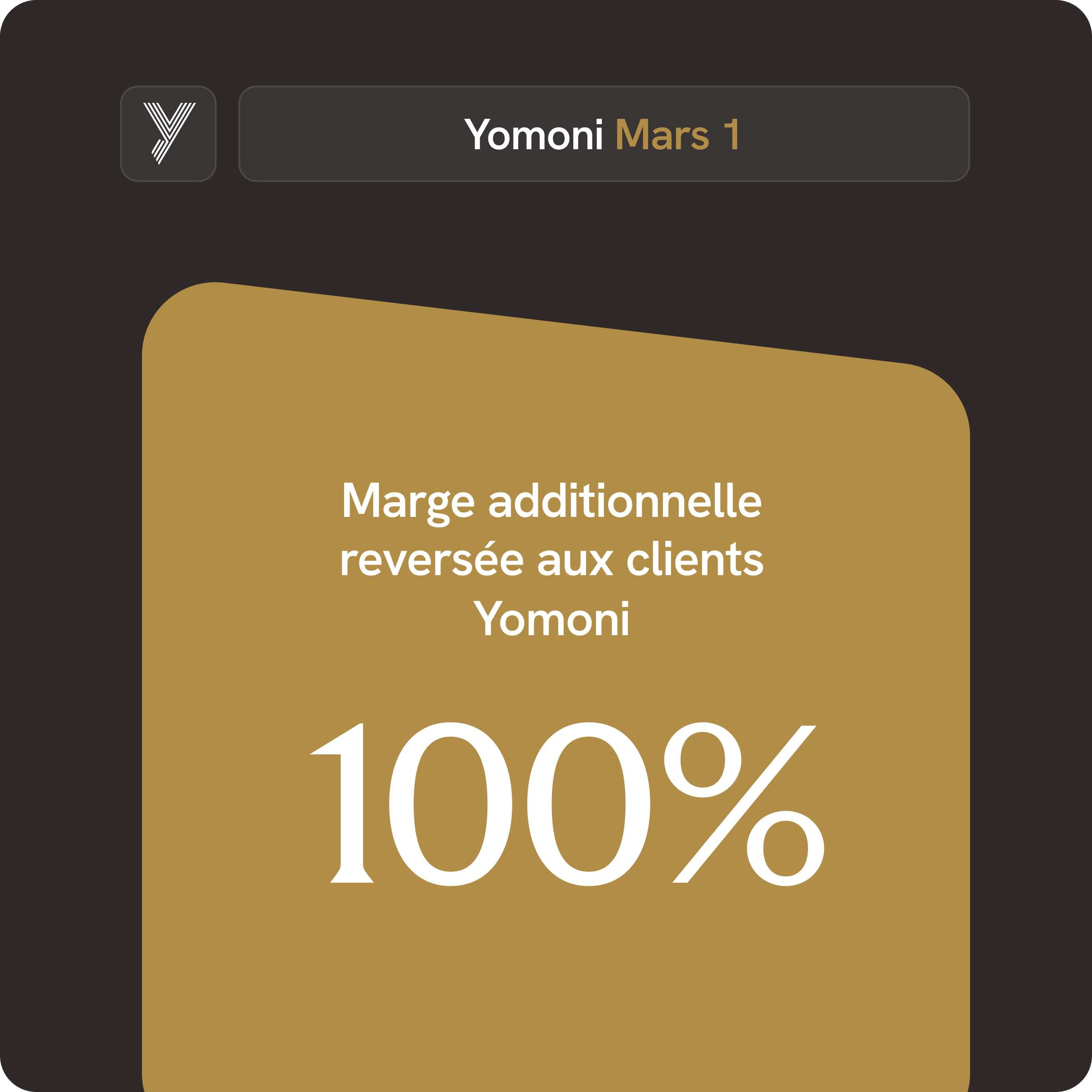 Fidèles à notre ADN, nous sommes la première et la seule société de gestion à afficher clairement notre commission de distribution de 2%, c'est-à-dire ce que Yomoni touchera lorsque vous investirez dans Yomoni Mars 1. Et nous allons encore plus loin.