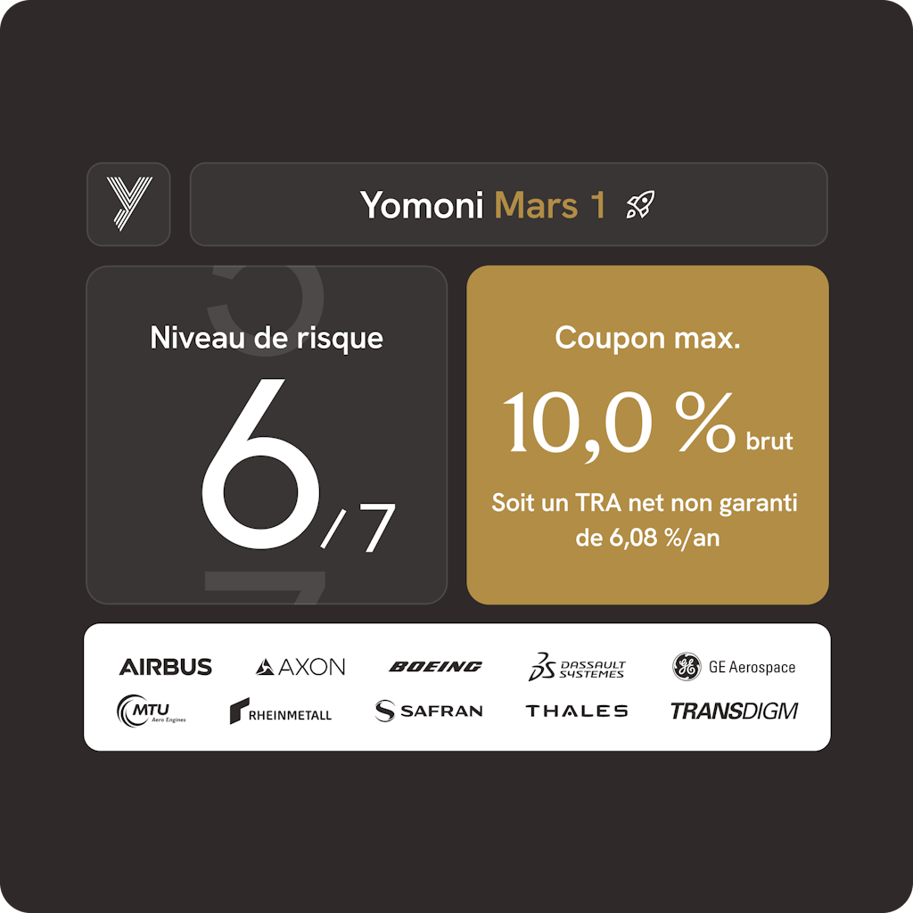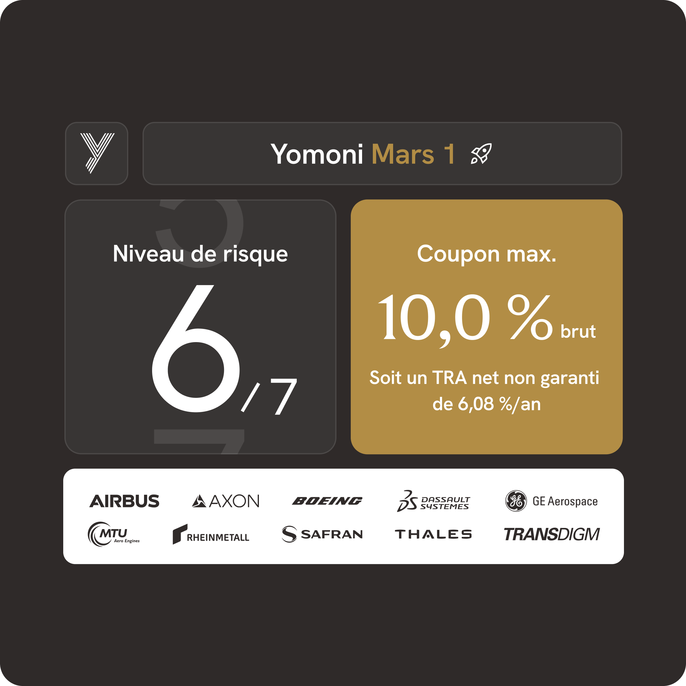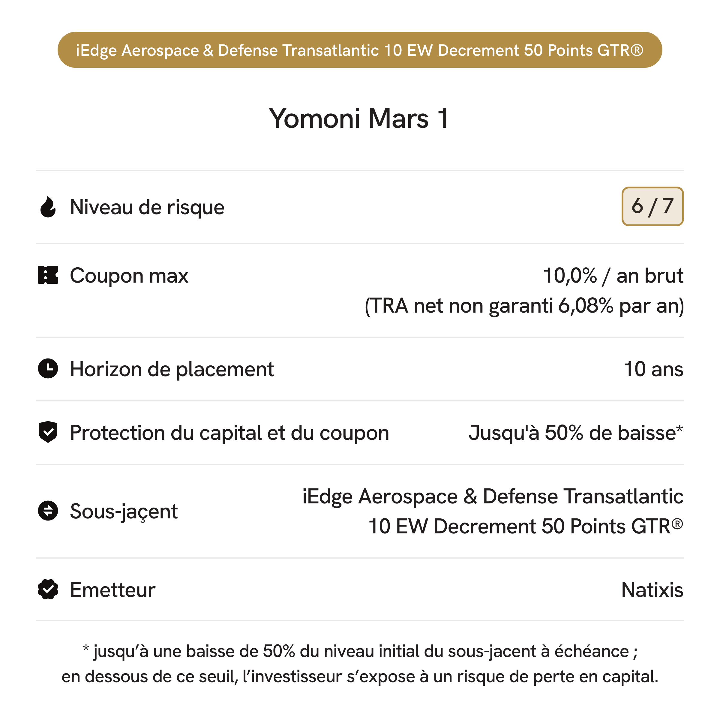 Yomoni Mars 1 vise un rendement brut pouvant atteindre 10,0 % brut par an (hors frais d'enveloppe de 0,6%), en fonction de l’évolution de l’indice iEdge Aerospace & Defense Transatlantic 10 EW Decrement 50 Points GTR®. Ce rendement est versé en cas de remboursement anticipé ou à l’échéance des 10 ans, sous réserve que l’indice n’ait pas baissé de plus de 50 % par rapport à son niveau initial.