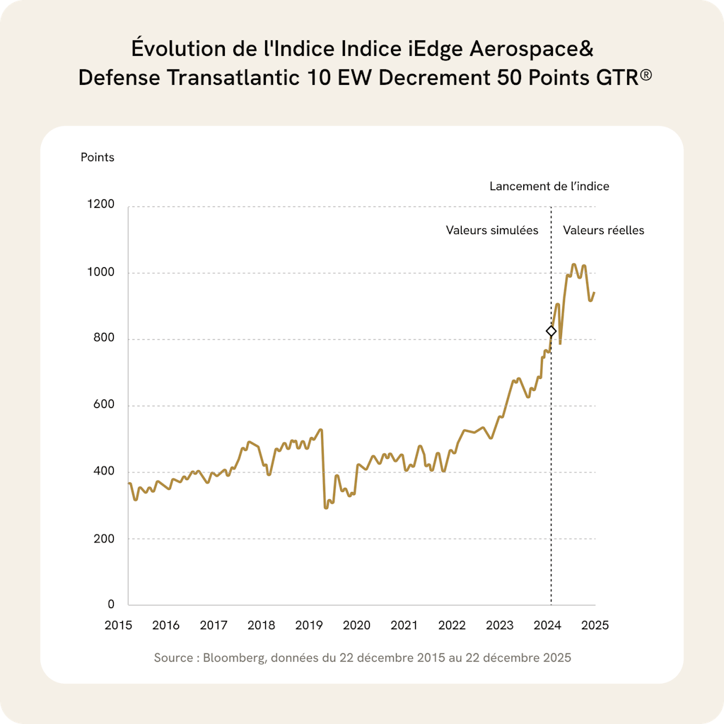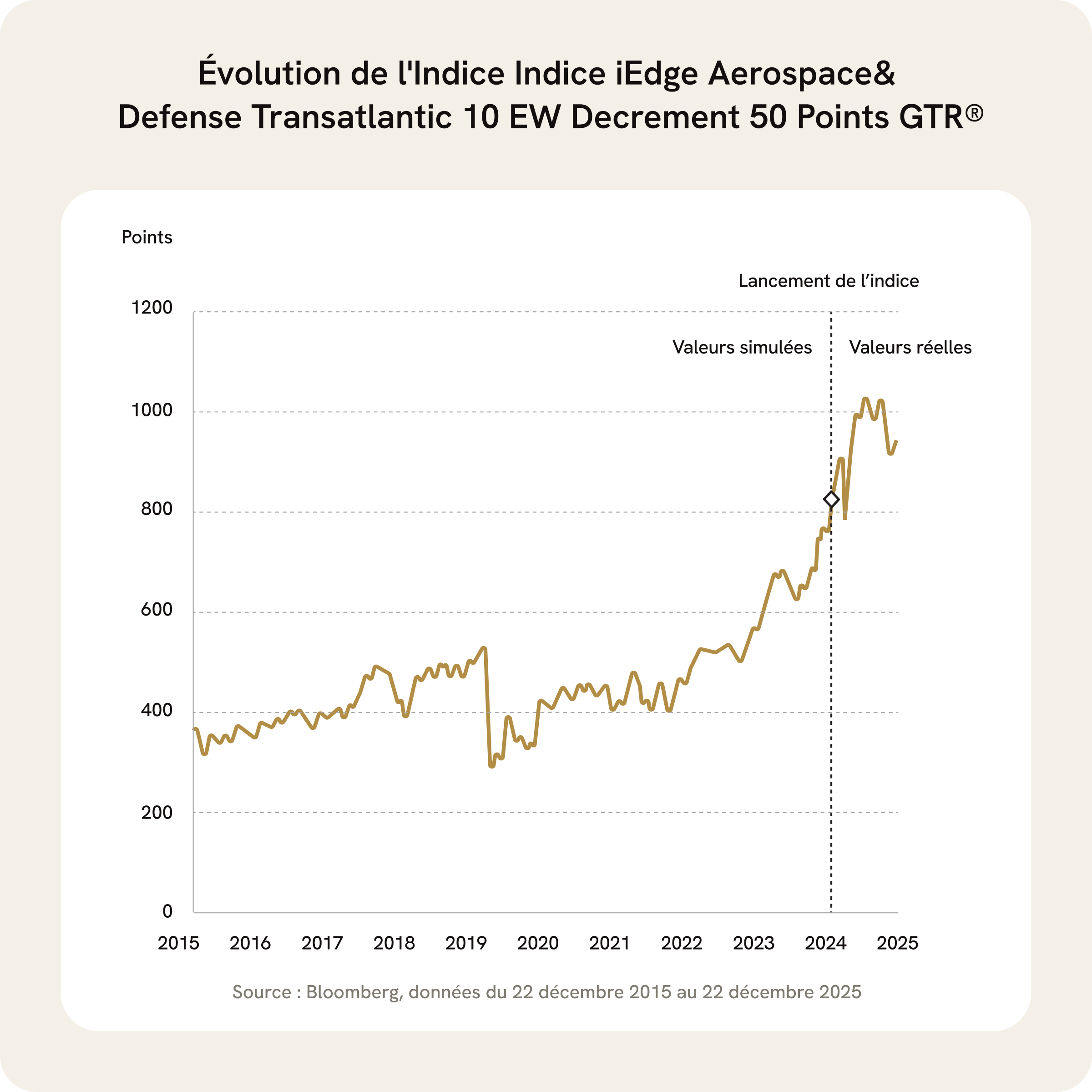 En tant que société de gestion, Yomoni a sélectionné l’indice iEdge Aerospace & Defense Transatlantic 10 EW Decrement 50 Points GTR® pour structurer Yomoni Mars 1.