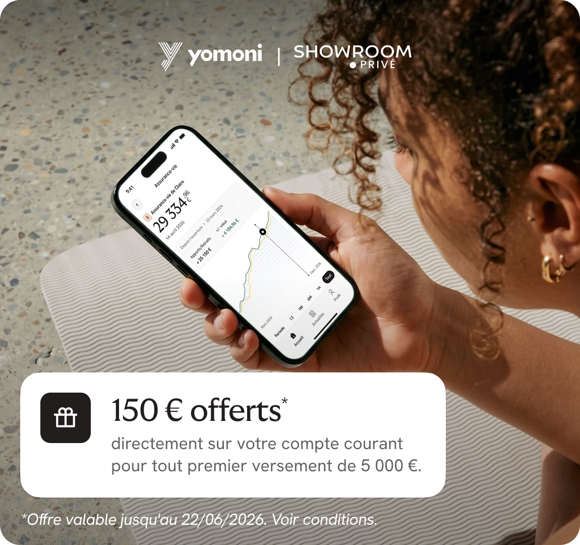 L'offre est réservée aux nouveaux clients pour une première adhésion à un contrat d'Assurance-vie, PER, PEA ou CTO chez Yomoni, avec un versement initial de 5 000€ minimum. Vous devez impérativement renseigner le code YOMONISHOW lors de votre inscription entre le 19 et le 22 avril 2026.
