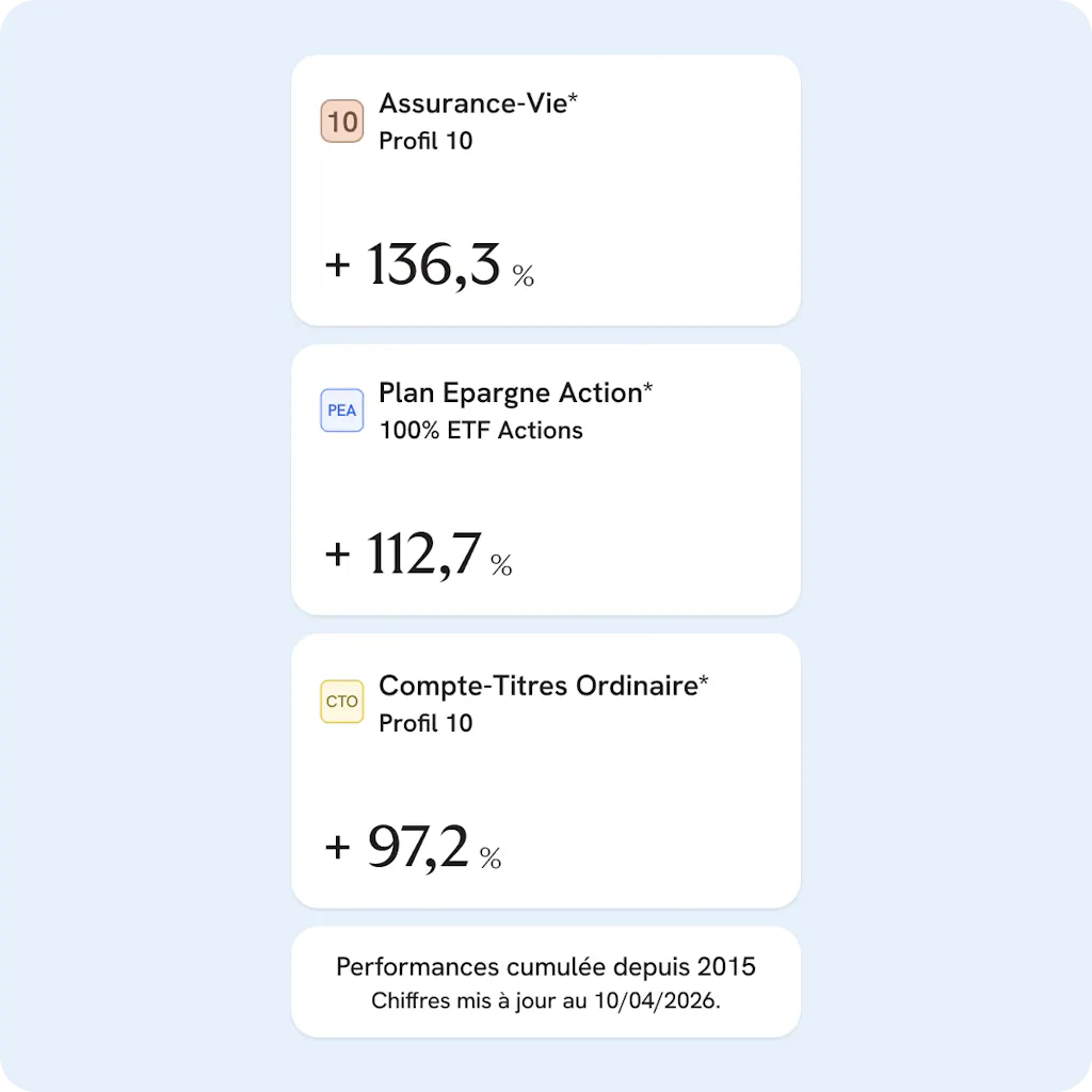 Atteindre +112,7 % de performance cumulée ne se fait pas au hasard. Sur le PEA, notre équipe de gestion ne cherche pas à deviner quelle action va monter. Elle applique une stratégie systématique et éprouvée en investissant dans des indices globaux. Vous captez ainsi la performance globale des marchés actions, avec une gestion des risques millimétrée.