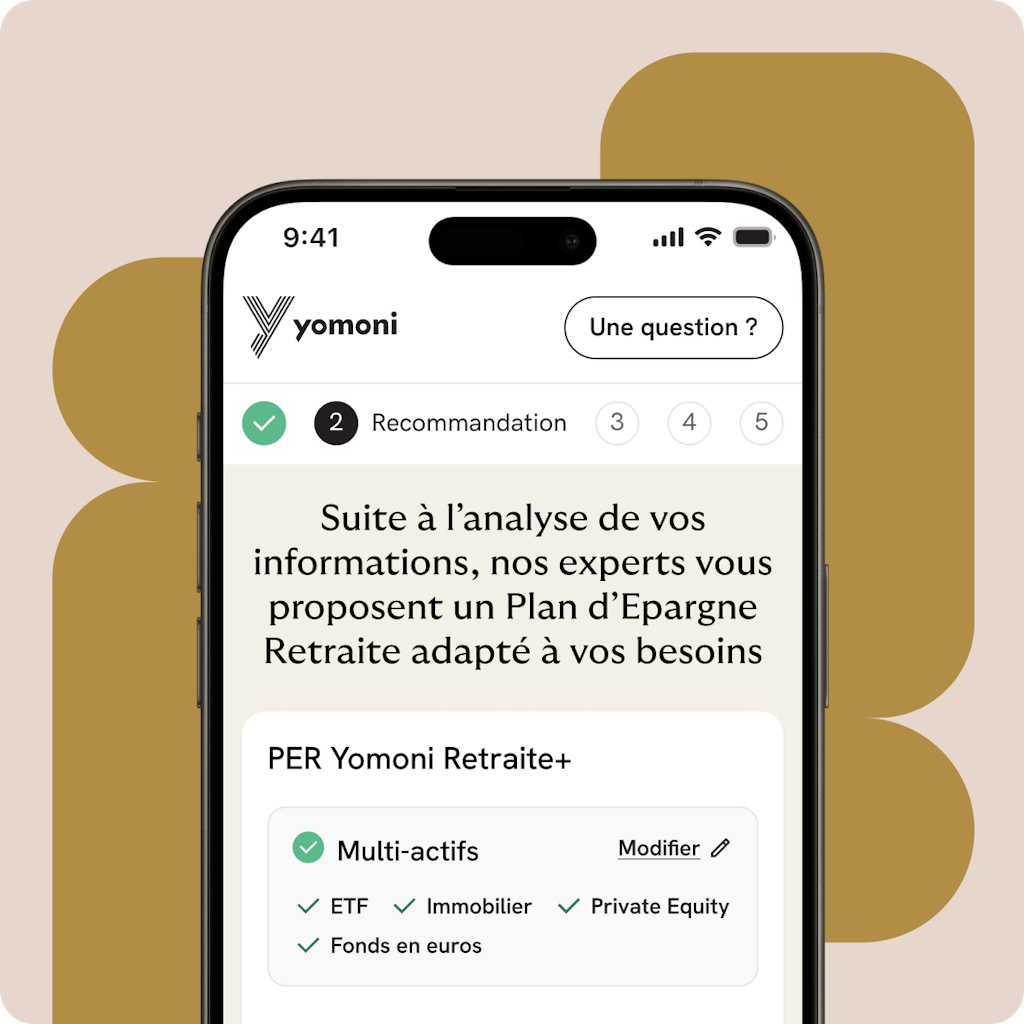 Le Plan Épargne Retraite (PER) Yomoni est un produit d'épargne dédié à la préparation de votre retraite. Il vous permet de constituer progressivement un capital que vous pourrez récupérer une fois à la retraite, sous forme de rente, de capital ou une combinaison des deux. Yomoni gère vos investissements en tenant compte de votre profil et de vos objectifs, tout en vous permettant de bénéficier des avantages fiscaux du PER.